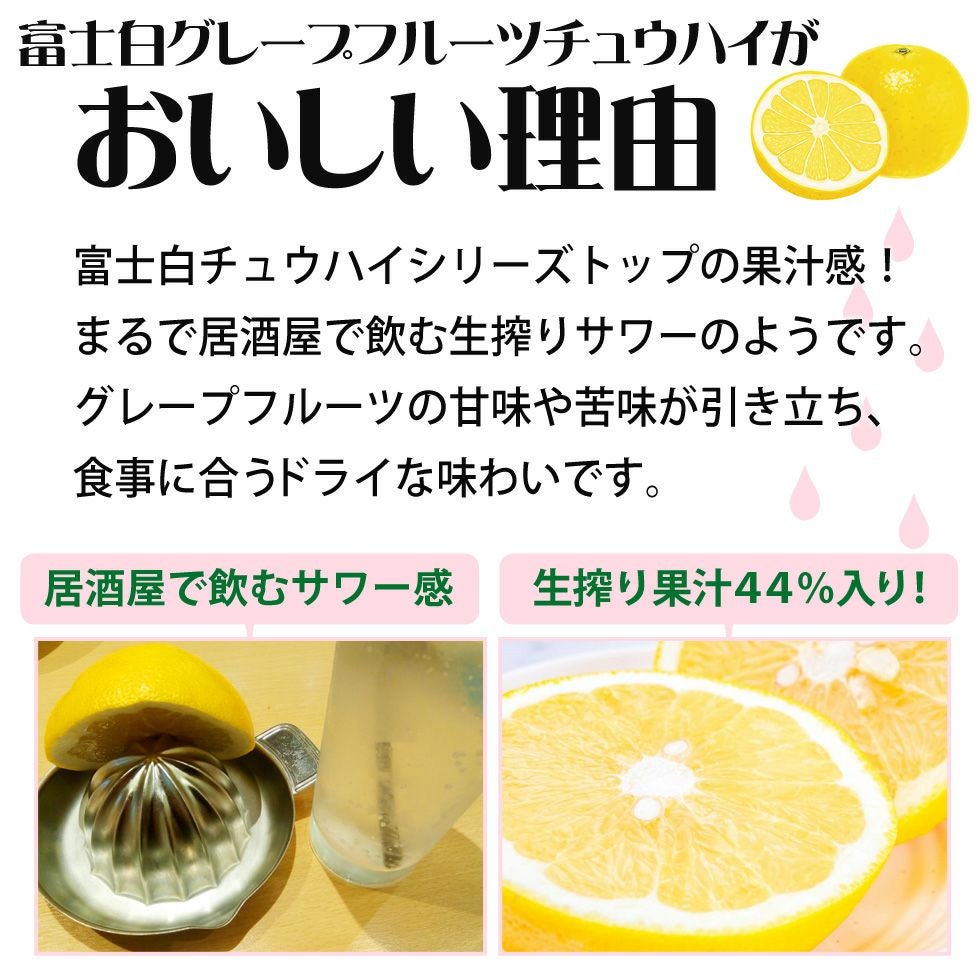 富士白チュウハイは、生搾り感たっぷりで、居酒屋の生搾りサワーのように果汁感が楽しめます。25年間愛された味わいが9年ぶりに復刻!炭酸で割ってたっぷり楽しめるチュウハイです。